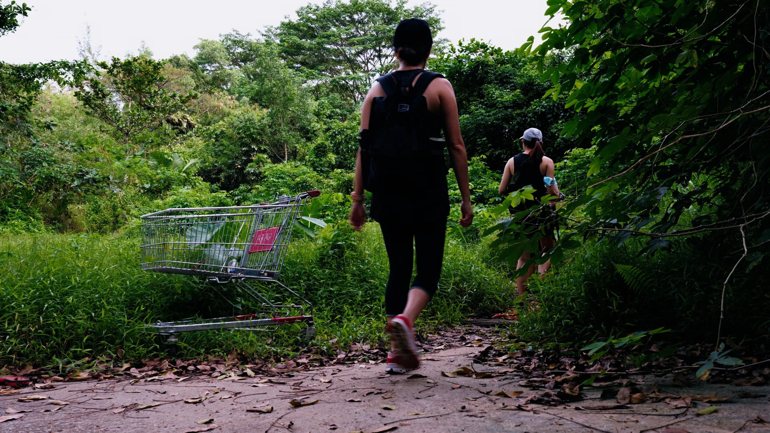 As you walk further along, you might come across an abandoned shopping cart. Head on the path to the right.